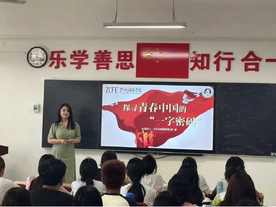 陆瑶老师由探寻青春中国的“一字密码”引入,首先带领同学们一同回顾了党的百年奋斗征程中的重要历史节点,接着引用陈祥榕、樊锦诗、陈贝儿的人物故事,诠释了“一心为国”、“一生一事”、“一往无前”的奋斗密码。她指出:实现中华民族伟大复兴是一场接力跑,作为新时代青年要志存高远、脚踏实地,希望青年们能够在这个时代绽放绚丽之光,解锁更多青春中国的“一字密码”!