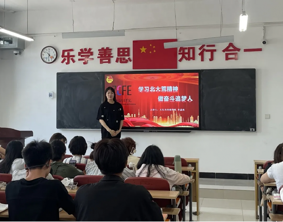 李嘉歆老师由聂绀弩的《北大荒歌》引入,详细介绍了“北大荒精神”是艰苦奋斗、勇于开拓、顾全大局、无私奉献的十六字精神。以邓稼先、袁隆平以及毛腊生三位杰出人物的优秀事迹勉励同学们要有目标,有理想、勇敢追梦。她指出:作为新时代老员工,奋斗正当其时,各位同学要早立志、立长志,立大志,将自己的人生志向,同祖国和人民联系在一起!
